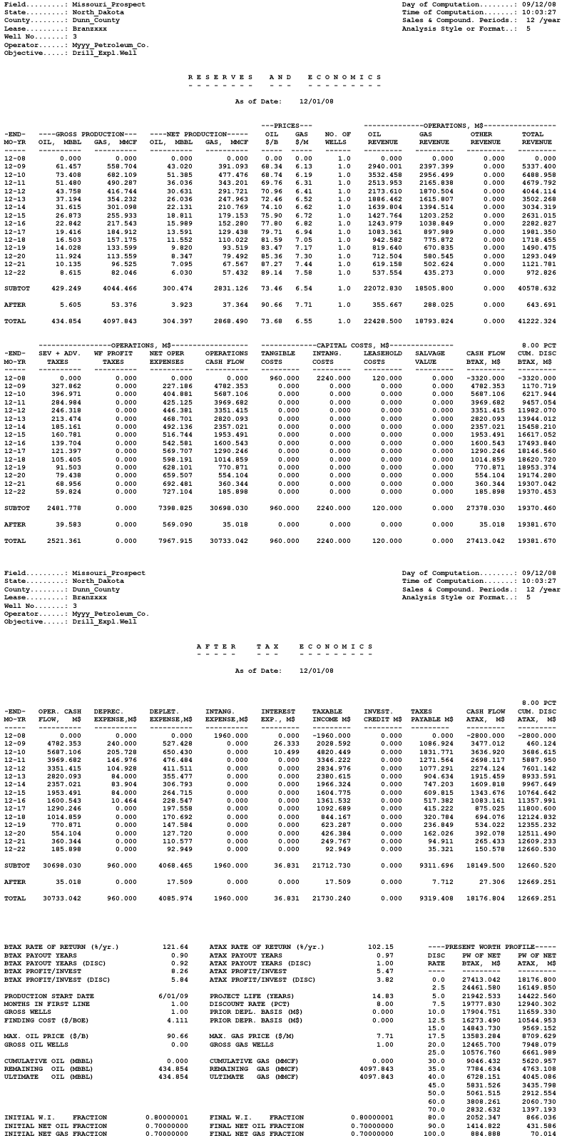 The following cash flow evaluation is of a prospect in the Badlands of North Dakota....The Badlands area has high operating costs because of permafrost,