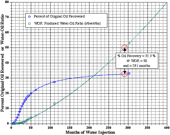 Recovery = 32.3 % of Original Oil at WOR = 50 and 291 months months of injection. |