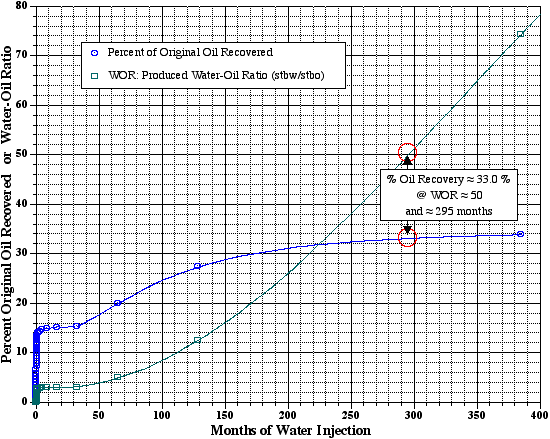 Recovery = 33.0 % of Original Oil at WOR = 50 and 295 months of injection. |